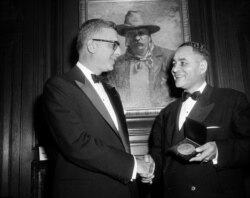 Dr. Ralph Bunche (D) recibe Medalla de la Asociación Theodore Roosevelt de manos de Oscar Strauss
